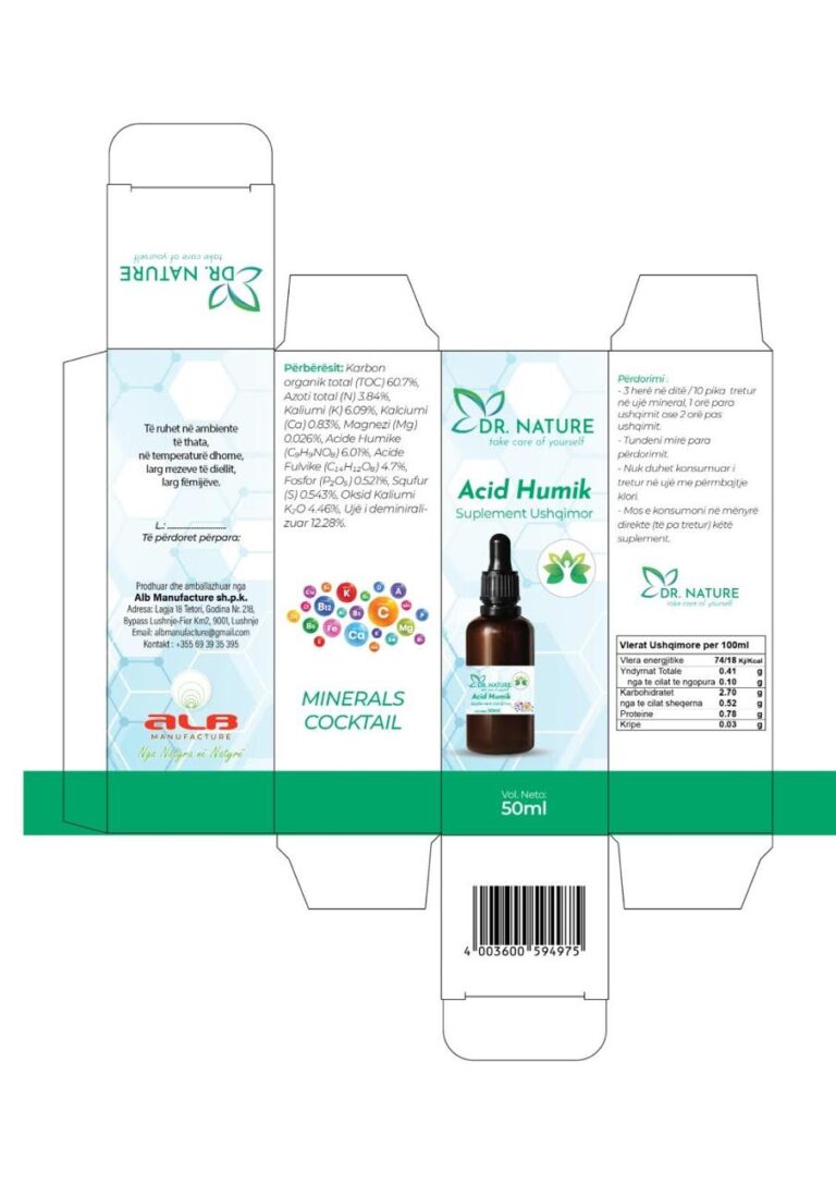Dr. Nature është një suplement ushqimor natyral i përbërë nga acidet humike, acidet fulvike, mbi 75 elemente makro dhe mikro minerar dhe ujë i demineralizuar. Këto acide ekstragohen nga një formacion gjeologjik rreth 80 milion vjet i vjeter i ndodhur në thellësitë e maleve veri lindore Shqiptare dhe janë të përbërë nga dekompozime antike të florës dhe faunës që kanë mbetur të izoluar dhe përqëndruar përgjatë lëvizjeve të ndryshme tektonike përgjatë mijëvjeçarëve. Ajo çfarë e bën të veçantë këtë material bazë nga i cili ne nxjerrim suplementin Dr. Nature është pikërisht ruajtja dhe rezervimi i tij në kushte optimale për një kohë kaq të gjatë duke ruajtur kështu karakteristikat e një ekosistemi shumë më të pastër, më të pasur dhe më të shëndetshëm nga ai i cili ne kemi sot. Humusi është baza e pjellorisë në tokë ku në pjesën më të madhe të tij përmban grupin bazik esencial të mineralve që i nevojiten cilësdo formë jete për tu formuar dhe ekzistuar, prandaj këto minerale i gjejmë kudo ku ka jetë si në tokë, ujë, bimë, kafshë dhe njerëz. Ne me anë të Dr. Nature i sjellim këto minerale në formë të përqëndruar dhe të sigurtë për shëndetin e përgjithshëm.